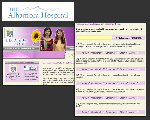 BHC Alhambra Hospital was interested in creating a way to connect with and then engage patients looking for assistance with an eating disorder. We felt that once we targeted the proper audience, we’d need to somehow engage them and start the relationship process. We determined that an online eating disorder survey would be the best tactic. We worked closely with the medical professional staff to develop a custom eating disorder survey. Each survey was scored for symptom severity and the results emailed to the survey respondent.